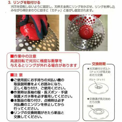 刈刃を回転しないように固定し、刃押え金具にリングをかぶせ、リングを押し込みながら回すと固定されます。