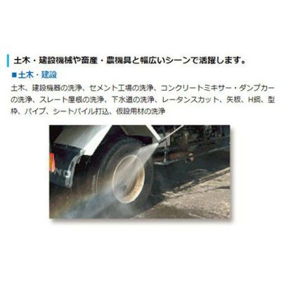 土木、建設機器の洗浄、セメント工場の洗浄、コンクリートミキサー・ダンプカーの洗浄、スレート屋根の洗浄、下水道の洗浄、レータンスカット、矢板、H鋼、型枠、パイプ、シートパイル打込、仮設用材の洗浄