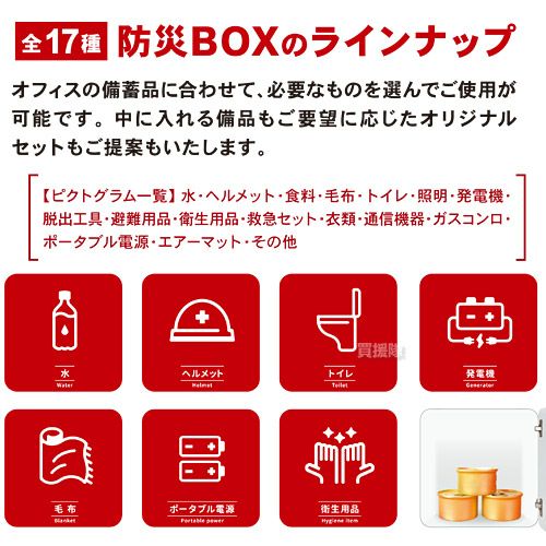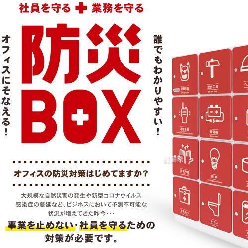 他の画像を見る 【送料無料】オフィスに合わせてカスタムできる防災棚! 防災BOX 4ケース (2段×2列) DSB-004220 買援隊 特別価格 ¥ 181,500 税込 詳細を見る お気に入りに登録する