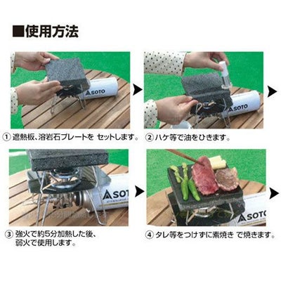 溶岩石プレートは、レギュレーターストーブST-310に取り付けて使用します。ゴトクに遮熱板を通し、溶岩石プレートをのせるだけで、バーベキューをどこでも楽しめます。