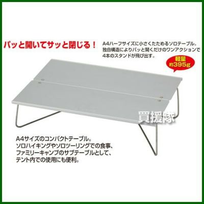 ソロハイキングやソロツーリングでの食事用テーブルとして、ファミリーキャンプのサブテーブルやテント内テーブルとして。 様々な目的に使えるA4サイズのテーブルです。開くだけでスタンドが飛び出す独自構造により、一瞬で広げることができます。 しまう時も、閉じるだけでスタンドが収納されます。