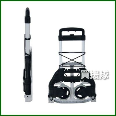 ■耐荷重 50kg ◎荷台のプレートを開くと、収納されているタイヤも連動して開きます。プレートを閉じるとタイヤも自動的に収納されます。 ◎取っ手はボタンを押し、引き出すとロックされます。(長さ調節は一段階のみ)