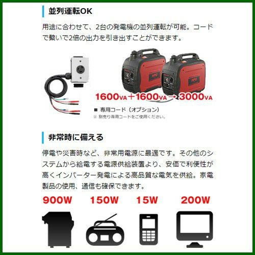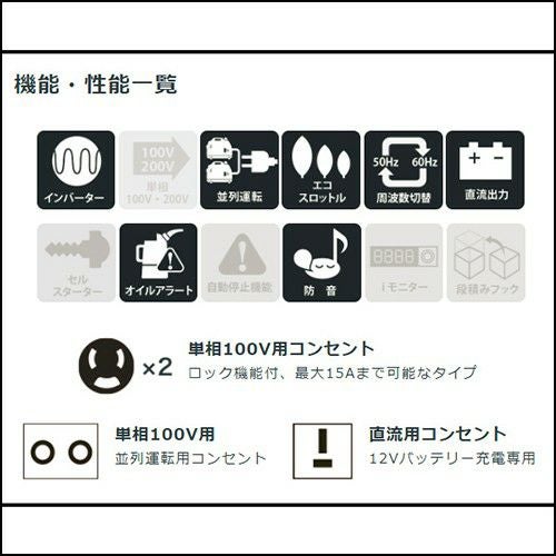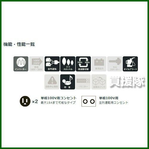 他の画像を見る 【送料無料】2.0kVA防音型、驚異の軽さ32kg! 新ダイワ 4サイクルインバータ発電機 iEG2000M-Y 買援隊 特別価格 ¥ 194,600 税込 カートに入れる お気に入りに登録する