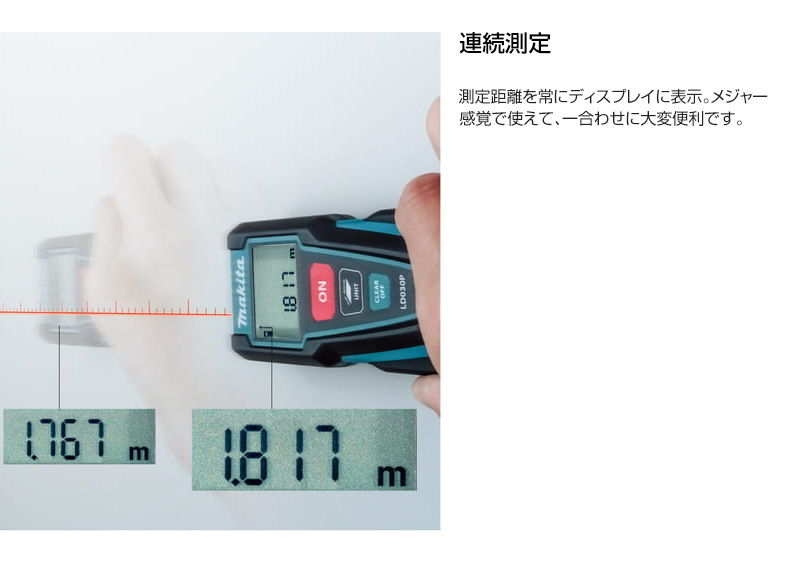 【連続測定】測定距離を常にディスプレイに表示。メジャー感覚で使えて、一合わせに大変便利です。