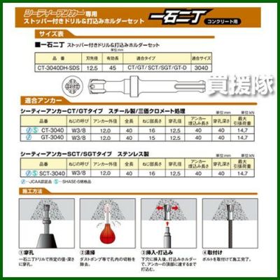 シティーアンカー専用 ストッパー付きドリル&打ち込みホルダーセット 軽量ハンマードリル用(コンクリート用) これ1本で穿孔+打込み (1)ストッパー付きドリルで穿孔 (2)打ち込みホルダーで打ち込み ホルダー脱着防止クリップ付き ホルダーを差し込んでロックできます。
