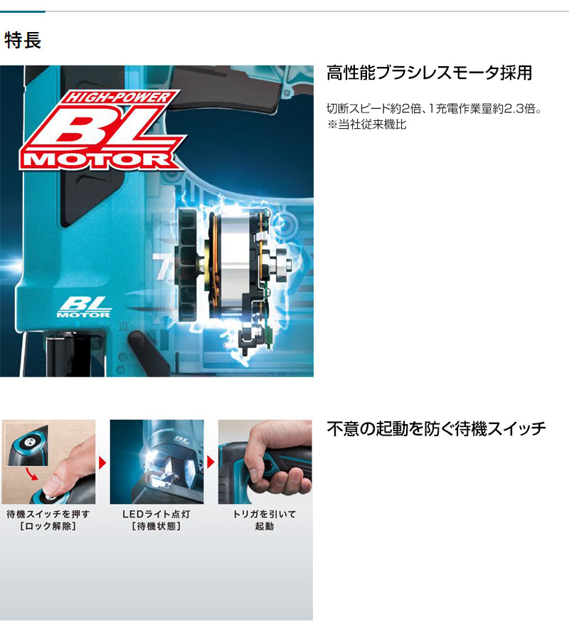 【高性能ブラシレスモータ採用】切断スピード約2倍、1充電作業量約2.3倍。※当社従来機比