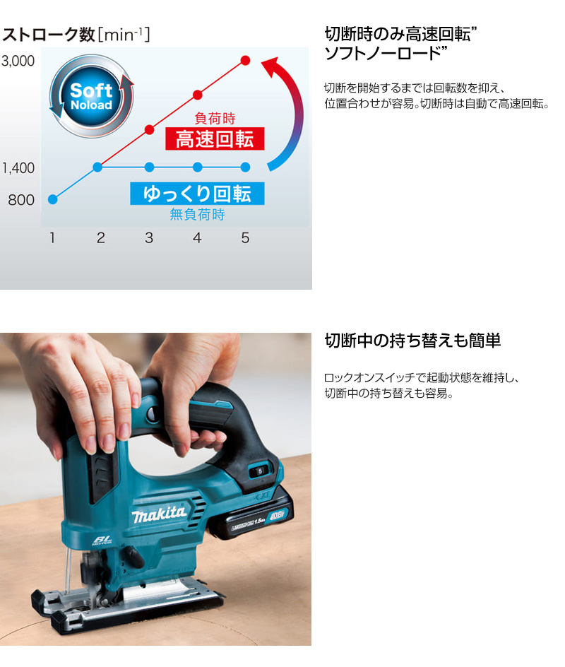 【切断時のみ高速回転”ソフトノーロード”】切断を開始するまでは回転数を抑え、位置合わせが容易。切断時は自動で高速回転。