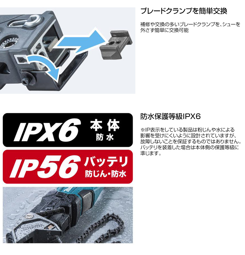【防水保護等級IPX6】※IP表示をしている製品は粉じんや水による影響を受けにくいように設計されていますが、故障しないことを保証するものではありません。バッテリを装着した場合は本体側の保護等級に準じます。