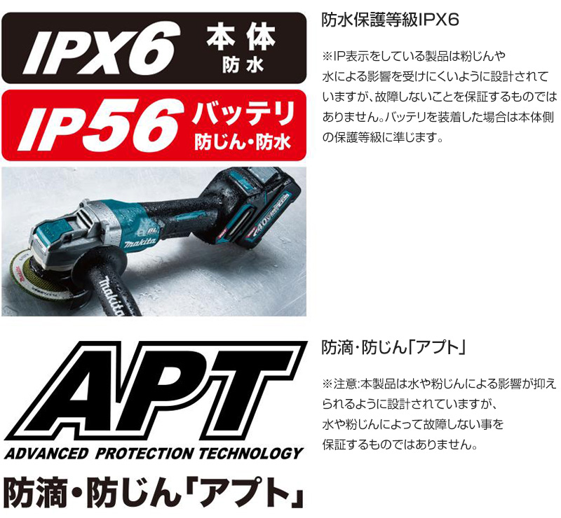 【防水保護等級IPX6】※IP表示をしている製品は粉じんや水による影響を受けにくいように設計されていますが、故障しないことを保証するものではありません。バッテリを装着した場合は本体側の保護等級に準じます。