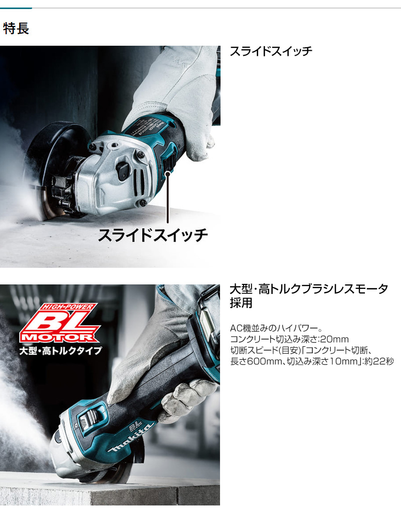 [切断スピード(目安)「コンクリート切断、長さ600mm、切込み深さ10mm」]約22秒