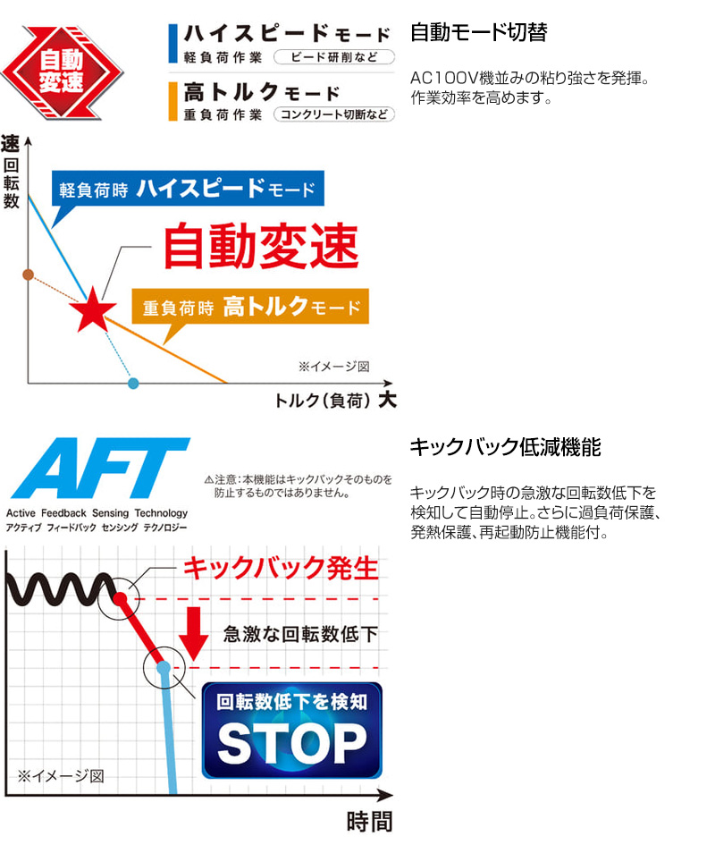 【キックバック低減機能】キックバック時の急激な回転数低下を検知して自動停止。さらに過負荷保護、発熱保護、再起動防止機能付。