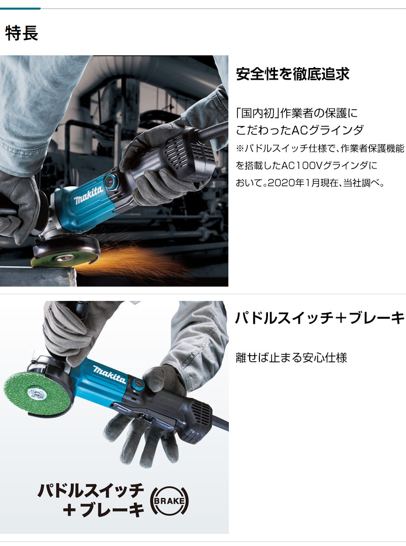 ※パドルスイッチ仕様で、作業者保護機能を搭載したAC100Vグラインダにおいて。2020年1月現在、当社調べ。