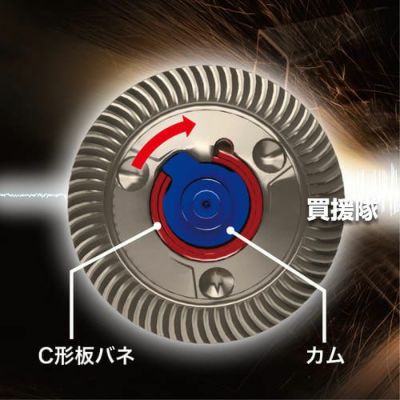 【C形板バネ】研削時に微振動が発生し、カムに伝わる→カムがC形板バネを広げる→C形板バネがクッションになり、振動を吸収。