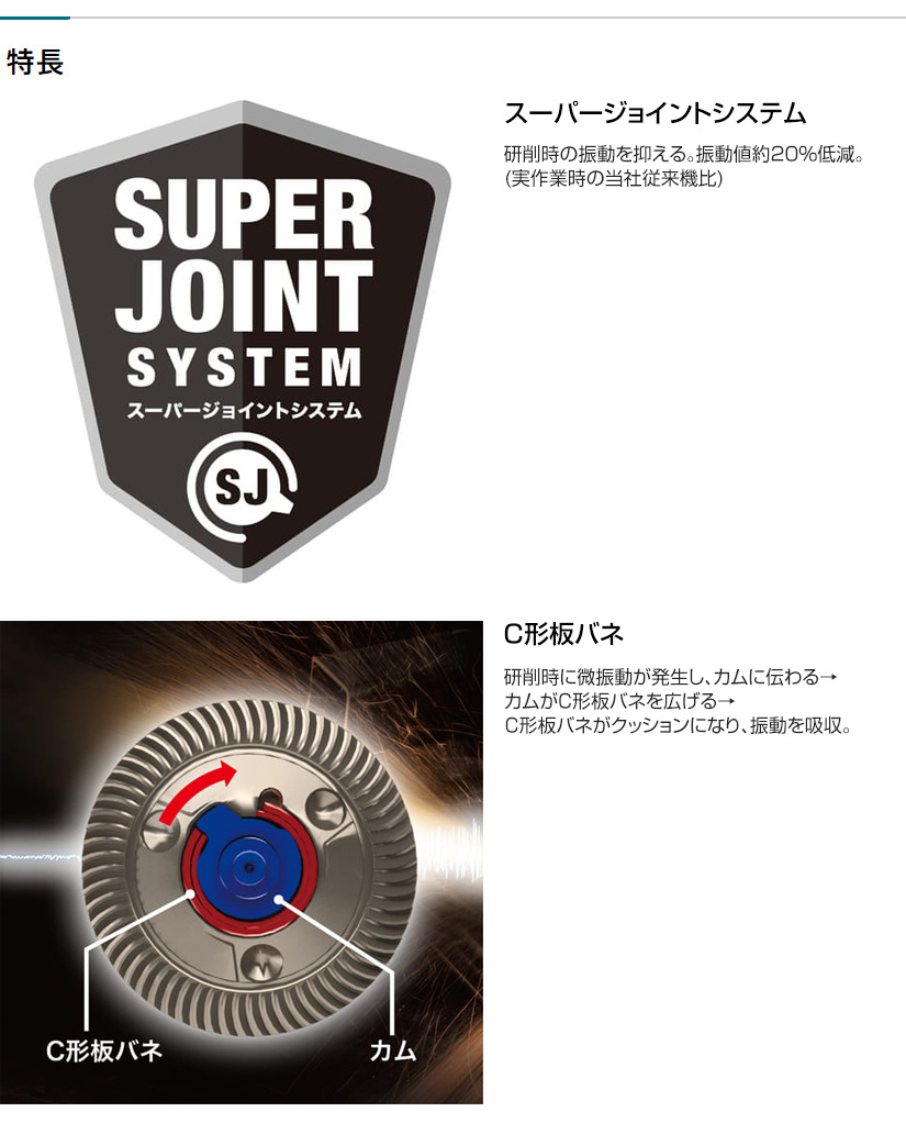 【スーパージョイントシステム】研削時の振動を抑える。振動値約20%低減。(実作業時の当社従来機比)