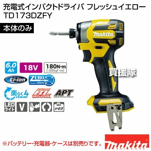 他の画像を見る 【送料無料】マキタ 充電式インパクトドライバ フレッシュイエロー マキタ 充電式インパクトドライバ フレッシュイエロー [本体のみ/バッテリー・充電器別売] TD173DZFY 買援隊 特別価格 ¥ 25,410 税込 在庫切れ 詳細を見る お気に入りに登録する