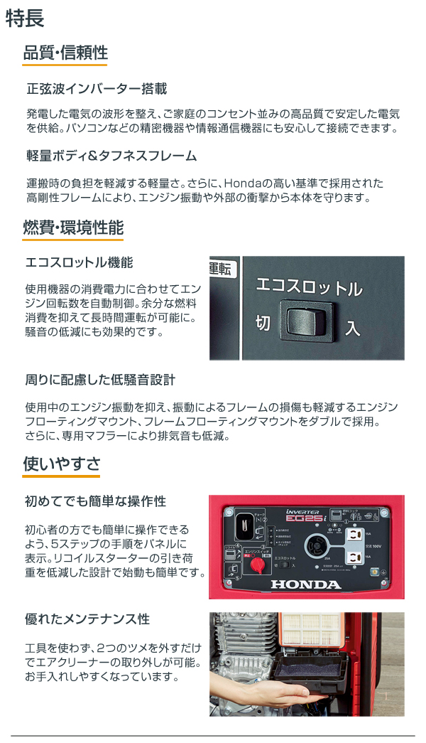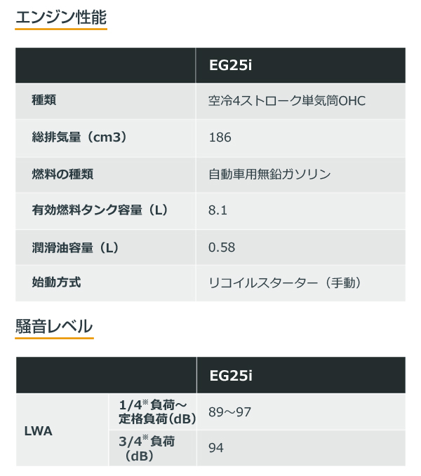 - 機能コンセント15A×2、30A×1、50/60周波数切替、オイルアラート