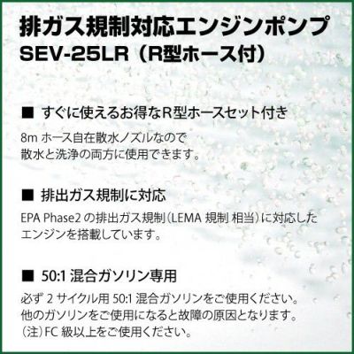 - 付属品 カップリングΦ25、2ヶ/カップリングパッキンΦ25、2ヶ/ホースバンドΦ32、3ヶ/Φ22、1ヶ/タヶノコニップル25x25、2ヶ/25x15、1ヶ/ストレーナー、1ヶ/吸入ホース、3m/吐出ホース、8m/自在散水ノズル、1ヶ/エンジン工具、1式