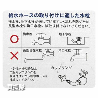 ●横水栓、地下水栓が適しています。水漏れを防ぐため、長型水栓や角口水栓には取り付けないでください。
