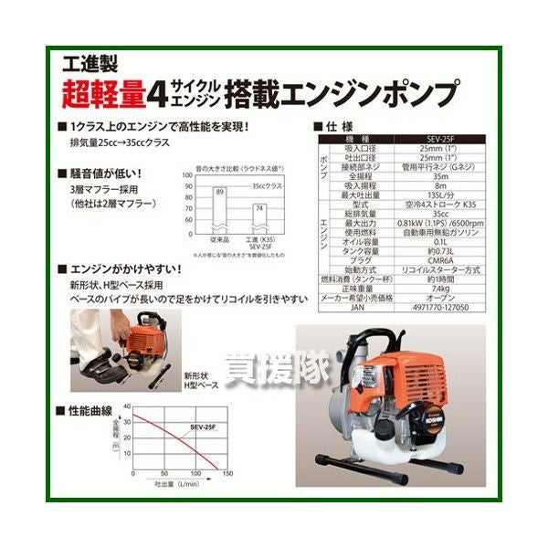 他の画像を見る 【送料無料】工進オリジナルエンジン搭載 工進 工進製 4サイクルエンジンポンプ(25mm) SEV-25F 買援隊 特別価格 ¥ 29,800 税込 カートに入れる お気に入りに登録する