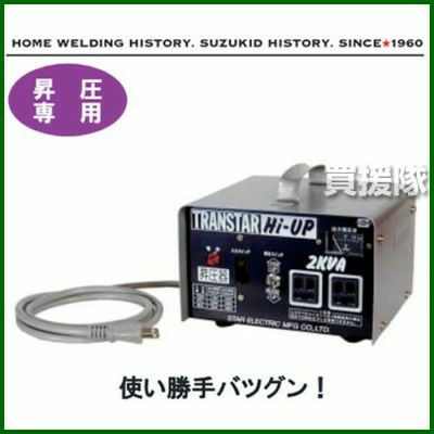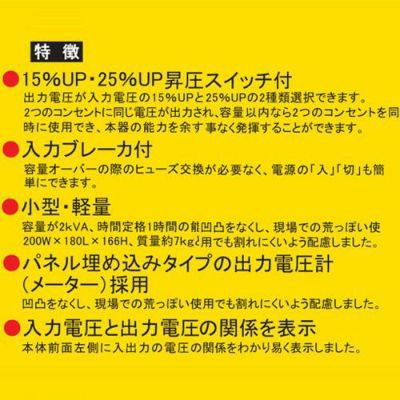 ★15%UP25%UP昇圧スイッチ付 出力電圧が入力電圧の15%UPと25%UPの2種類選択できます。2つのコンセントに同じ電圧が出力され、容量以内なら2つのコンセントを同時に使用でき、本器の能力を余す事なく発揮することができます。 ★ブレーカ付 容量オーバーの際のヒューズの交換が必要なく、電源「入」「切」も簡単にできます。 ★小型・軽量 容量が2KVA、時間定格1時間の能力があるにもかかわらず、寸法200W×180L×166H、重量約7kgと小型・軽量となっています。 ★パネルの埋め込みタイプの電圧計(メーター)採用 凹凸をなくし、現場での荒っぽい使用でも割れにくいよう配慮しました。 ★入力電圧と出力電圧の関係を表示 本体前面左側に、入・出力の電圧関係をひと目でわかるように、わかり易く表示しました。