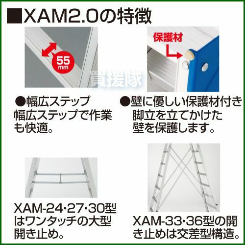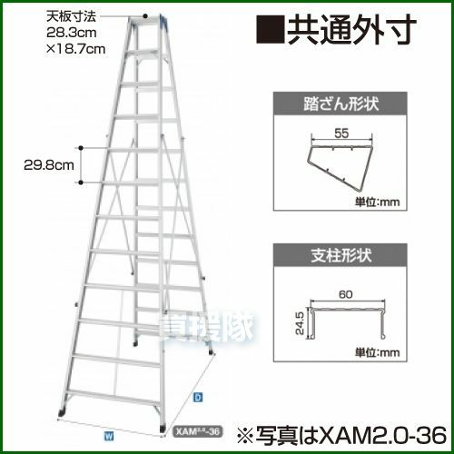 | 型式 | 天板高さ (m) | はしご時長さ (m) | 重量 (kg) | 設置寸法(外寸)(cm) | 収納寸法(外寸)(cm) | |||
