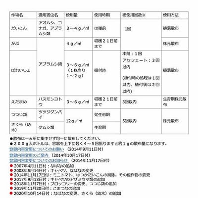 使用後の空容器は3回以上洗浄してから【200gボトル入】、空袋は良くたたいて中身を完全に出してから処理してください。間引き菜、つまみ菜に使用しないでください。みずかけな(水掛菜)、カラー及び花はすに使用する場合は、ほ場内に水がない状態で使用してください。また、使用後14日間は入水しないでください。ミツバチ及び蚕に影響がありますので注意して使用してください。