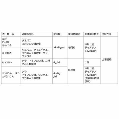 ※コガネムシ類幼虫に対して作物の生育期に使用する場合は植え溝に処理し軽く土を混和してください。適用作物群に属する作物またはその新品種に本剤をはじめて使用する場合は、使用者の責任において事前に薬害の有無を十分確認してから使用してください。なお、病害虫防除所または販売店等と相談することが望ましいです。