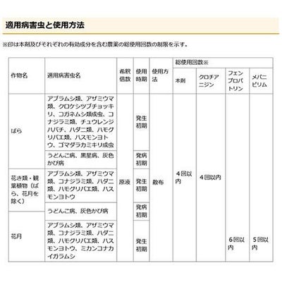 • ※使用に当たっては容器を良く振ってください(沈殿)。ぼけには使用はさけてください(薬害)。花き類に使用する場合、花弁に薬液が飛散するとシミ等の症状が出るおそれがあるので、花にかからないように注意してください。ツノロウムシの防除に使用する場合は、虫令が進むと効果が劣るので若令幼虫を対象にしてください。おうとうにはかからないように注意してください。