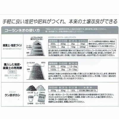 コーランネオは酵母・乳酸菌・麹菌培養物を米ぬかに吸着、各種ミネラル・糖・低分子キチンキトサン・数種のアミノ酸を組み合わせた醗酵腐熟促進剤です。
