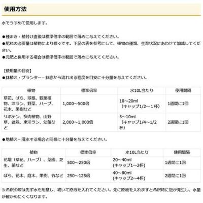 ※水で薄めて使用してください。種まき・植付け直後は標準倍率の範囲で薄めに与えてください。肥料の必要量は植物により様々です。下記の表を参考にして、植物の種類、生育状況にあわせて加減してください。元肥と併用する場合は標準倍率の範囲で薄めに与えてください。