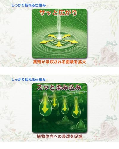 独自処方で雑草への拡展性と浸透性を高めた最新※の除草成分〈グリホサートカリウム塩〉が、雑草の葉茎表面にサッと広がりしっかり付着、根まで浸透してしっかり枯らします。