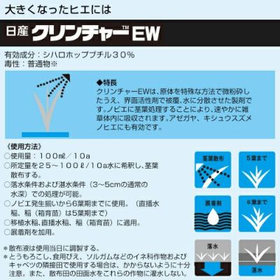【水稲用 除草剤 雑草 園芸 薬剤 薬 安心 ノビエ キシュウスズメノヒエ アゼガヤ 雑草防除 除草効果 移植水稲 直播水稲 移植後 発芽後 5葉期 6葉期 農業 資材 日産化学 水稲除草剤 後期 農薬 クリンチャーew ドローン ラジコンヘリ 無人航空機散布 中後期 ノビエ イネ科雑草 一年生イネ科雑草 雑草茎葉散布 全面散布 類白色粘稠乳濁液体 日産クリンチャーEW】
