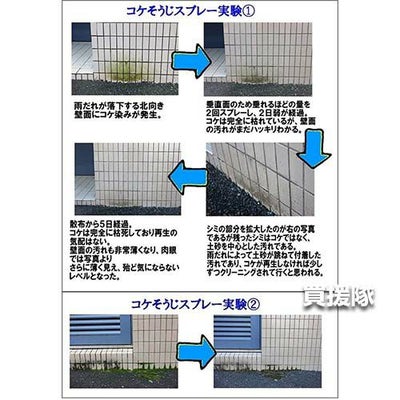 外壁などに染み付いた頑固なコケにスプレーするだけ。コケ全般に使用できて、水洗いは不要です。