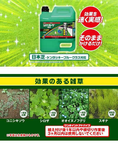 薄めずにそのまま散布できる、スポット除草にも便利な芝生に使える液状除草剤です。 日本芝(こうらいしば)とケンタッキーブルーグラスの中に生えた雑草に散布するだけで、葉や茎から成分が吸収されて根まで枯らす芝生専用の除草剤。 シロザ、コニシキソウ、タデ類、イヌビユ、ブタクサ等の一年生広葉雑草に効果を発揮します。しつこいスギナも枯らします。 植物特有の生理代謝に作用して雑草を枯らす除草剤です。
