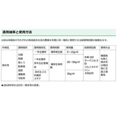 - ※雑草が大きくなりすぎると効果が劣るので、雑草発生前~生育初期、または雑草を刈払った後早めに散布してください。土壌が極端に乾燥しているときの使用はさけ、適度の水分を含んでいるときに使用してください(効果)。植栽地を除く樹木等の周辺地で使用する場合は、薬剤が樹木等の植栽地に流入または飛散するおそれのある場所等では使用しないでください(薬害)。