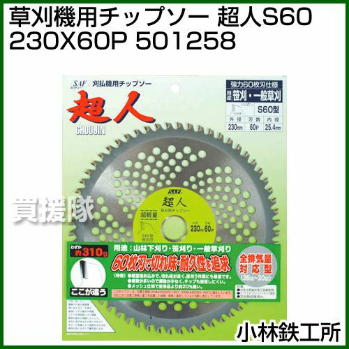 他の画像を見る 軽量メッシュ型・60枚刃で切れ味・耐久性を追求! 小林鉄工所 草刈機用チップソー 超人S60 230X60P 501258 買援隊 特別価格 ¥ 3,150 税込 カートに入れる お気に入りに登録する