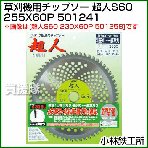 他の画像を見る 【送料無料】軽量メッシュ型・60枚刃で切れ味・耐久性を追求! 小林鉄工所 草刈機用チップソー 超人S60 255X60P 501241 買援隊 特別価格 ¥ 4,240 税込 カートに入れる お気に入りに登録する