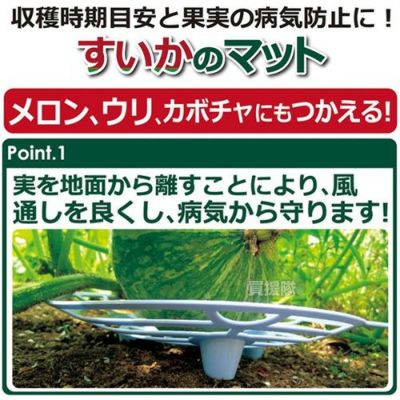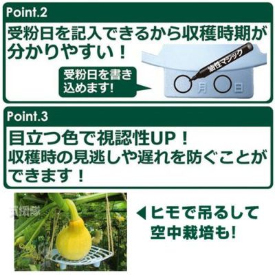 メロン、ウリ、カボチャにつかえます。果実を地面から離すことにより風通しを良くし、病気から守ります。受粉日を記入できるため、収穫時期が分かりやすく、目立つ色で果実の見逃しを防止します。