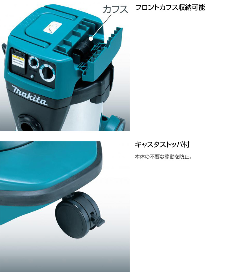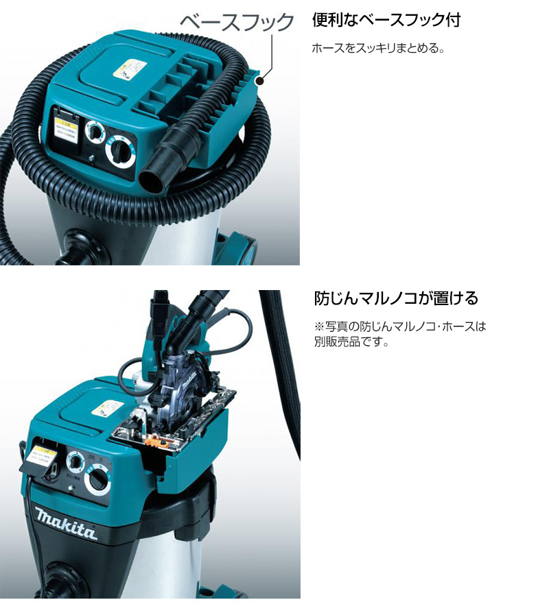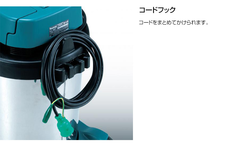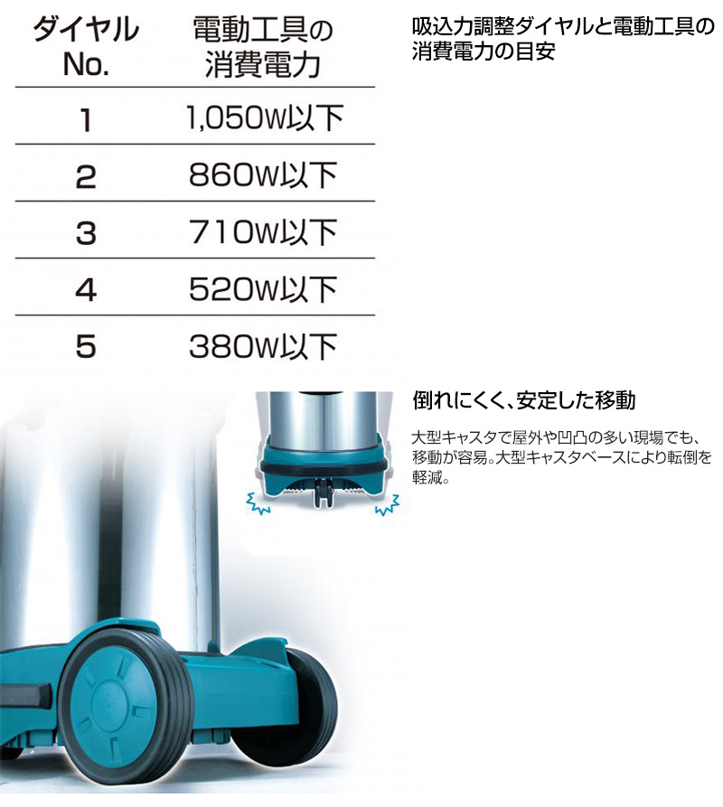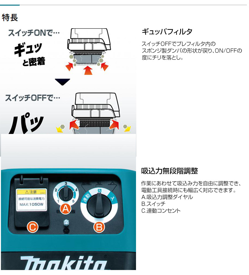 最大吸込仕事率300Wのハイパワー ステンレスタンク集じん機 <特長> 【ギュッパフィルタ】スイッチOFFでプレフィルタ内のスポンジ製ダンパの形状が戻り、ON/OFFの度にチリを落とし。 【吸込力無段階調整】作業にあわせて吸込み力を自由に調整でき、電動工具接続時にも幅広く対応できます。 A.吸込力調整ダイヤル B.スイッチ C.連動コンセント 【吸込力調整ダイヤルと電動工具の消費電力の目安】 【倒れにくく、安定した移動】大型キャスタで屋外や凹凸の多い現場でも、移動が容易。大型キャスタベースにより転倒を軽減。 【便利なベースフック付】ホースをスッキリまとめる。 【防じんマルノコが置ける】※写真の防じんマルノコ・ホースは別販売品です。 【フロントカフス収納可能】 【キャスタストッパ付】本体の不要な移動を防止。 【コードフック】コードをまとめてかけられます。