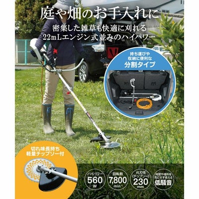 チップソー付 ナイロンコードも使える 二重絶縁構造 セフティスイッチ 延長コード10m付 収納や車での持ち運びに便利な分割タイプ 気にせず使える静かな動作音