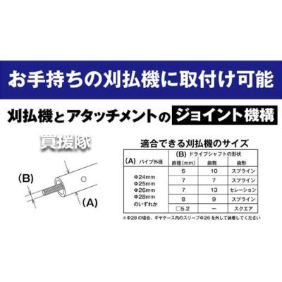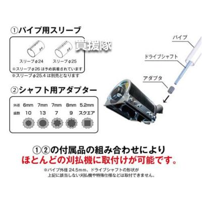 ※パイプ外径24.5mm、ドライブシャフトの形状が該当しない刈払機や特殊仕様などは取り付けできません。