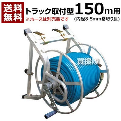 【この製品の特長】 フック付で軽トラックのアオリに取り付けできます。 φ8.5mmホース150m巻(φ8.5ヨリ戻シ金具付) ※フック有効幅3.5cm ホースは別売
