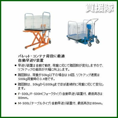 ※こちらの商品は代金引換はご利用いただけません。 ※重量物の為、車上渡しとなります。商品の受け取り時はフォークリフトなどをご準備の上でお受け取り下さい。足踏式フォーク・タイプ パレット・コンテナ荷役に最適