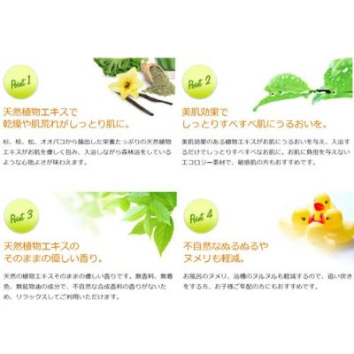 天然の植物エキスの入浴剤だから、不自然な香料臭もありません。天然の植物エキスの入浴剤でのバスタイムは、まるで森林浴感覚の心地よさです。