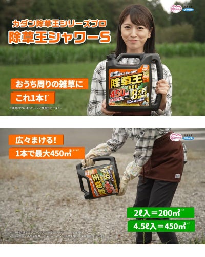 「カダン除草王シリーズプロ 除草王シャワーS」が適用拡大し、より広くまけるようになりました。2L入で最大200m2※まで一度に散布できるので、空き地や駐車場などの広いスペースもしっかり除草できます。