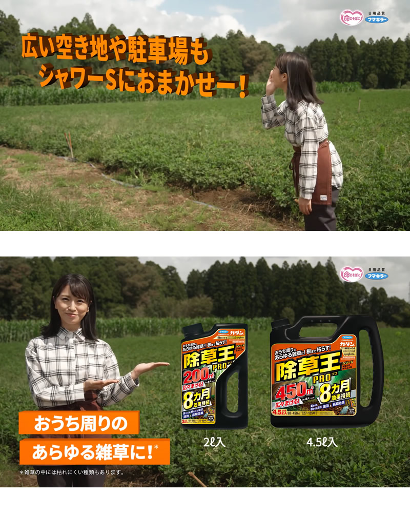 「カダン除草王シリーズプロ 除草王シャワーS」が適用拡大し、より広くまけるようになりました。2L入で最大200m2※まで一度に散布できるので、空き地や駐車場などの広いスペースもしっかり除草できます。