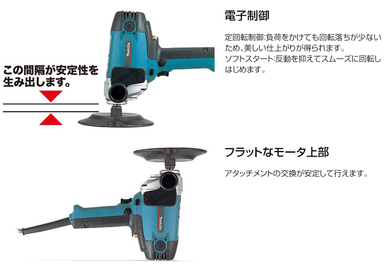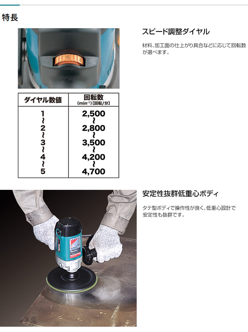 ダイヤル変速付電子制御&低重心で安定作業 <特長> 【スピード調整ダイヤル】材料、加工面の仕上がり具合などに応じて回転数が選べます。 【安定性抜群低重心ボディ】タテ型ボディで操作性が良く、低重心設計で安定性も抜群です。 【電子制御】 定回転制御:負荷をかけても回転落ちが少ないため、美しい仕上がりが得られます。 ソフトスタート:反動を抑えてスムーズに回転しはじめます。 【フラットなモータ上部】アタッチメントの交換が安定して行えます。