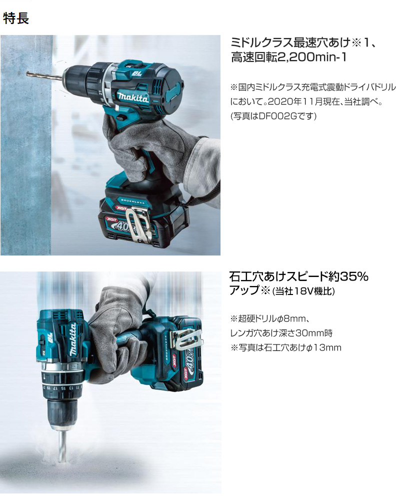 【ミドルクラス最速穴あけ※1、高速回転2,200min-1】※国内ミドルクラス充電式震動ドライバドリルにおいて。2020年11月現在、当社調べ。(写真はDF002Gです)
