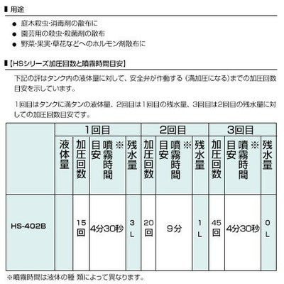 面倒な薬剤散布がぐーんと楽に 家庭園芸から農業用まで幅広く使えます。 【用途】 ●庭木殺虫・消毒剤の散布に ●園芸用の殺虫・殺菌剤の散布 ●野菜・果実・草花などへのホルモン剤散布に