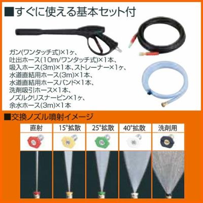 - 付属品ガン(ワンタッチ式)×1ヶ、吐出ホース(10m/ワンタッチ式)×1本、吸入ホース(3m)×1本、ストレーナー×1ヶ、水道直結用ホース(3m)×1本、水道直結用ホースバンド×1本、洗剤吸引ホース×1本、ノズルクリスナーピン×1ヶ、余水ホース(3m)×1本